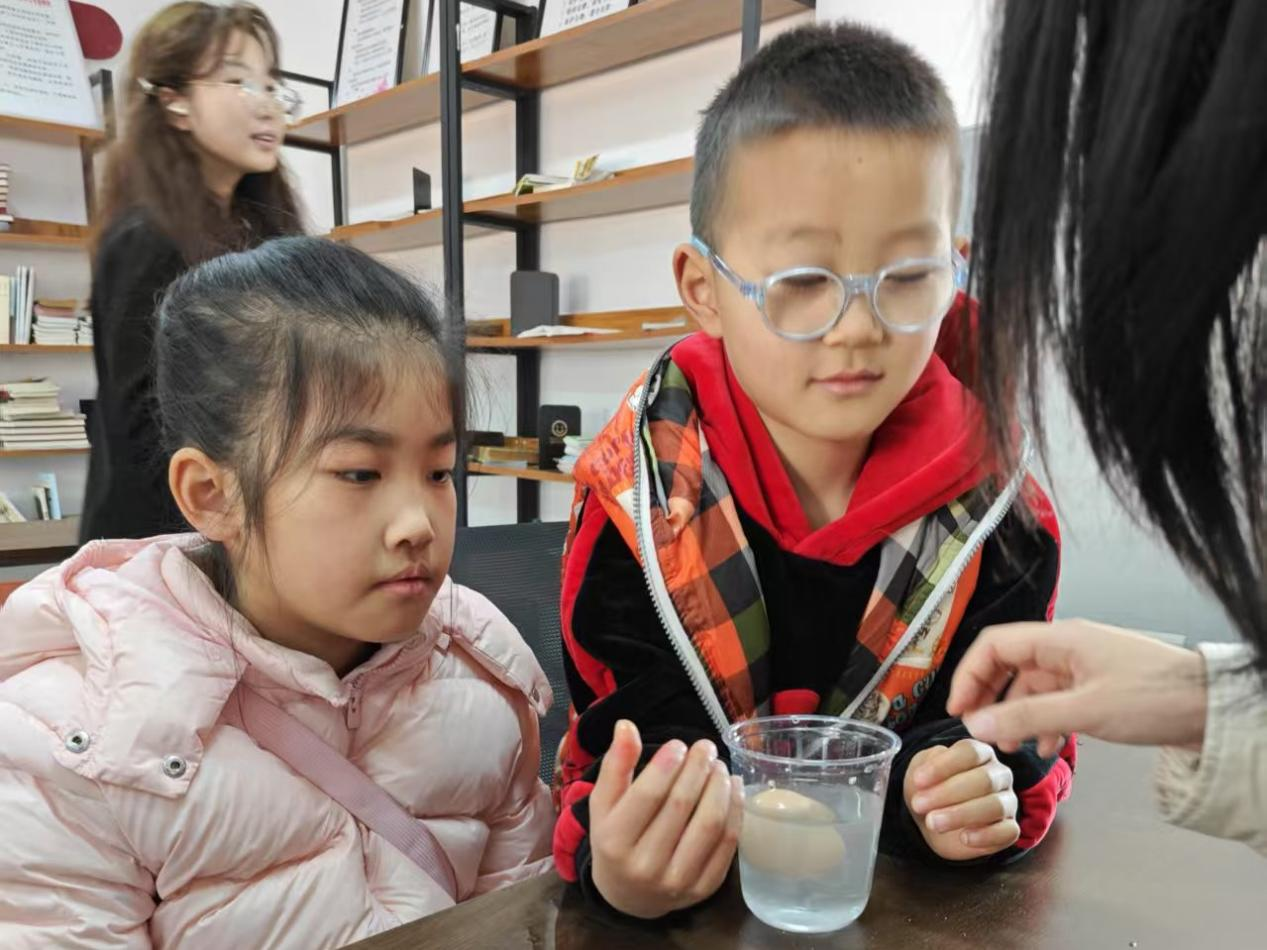 最后一个实验是“浮沉的鸡蛋”。小朋友们亲自操作,在玻璃杯里倒满水,把鸡蛋放进去,鸡蛋一下子就沉到了杯底。但通过一点一点往水里加盐,边加盐边搅拌。慢慢地,鸡蛋像睡醒了一样,从水底浮了起来。原来这是因为浮力原理,加盐可以让水的密度变大,当水的密度比鸡蛋大的时候,鸡蛋就能浮起来。小朋友们沉浸于欢乐到科学氛围,感受到科学的奇妙。