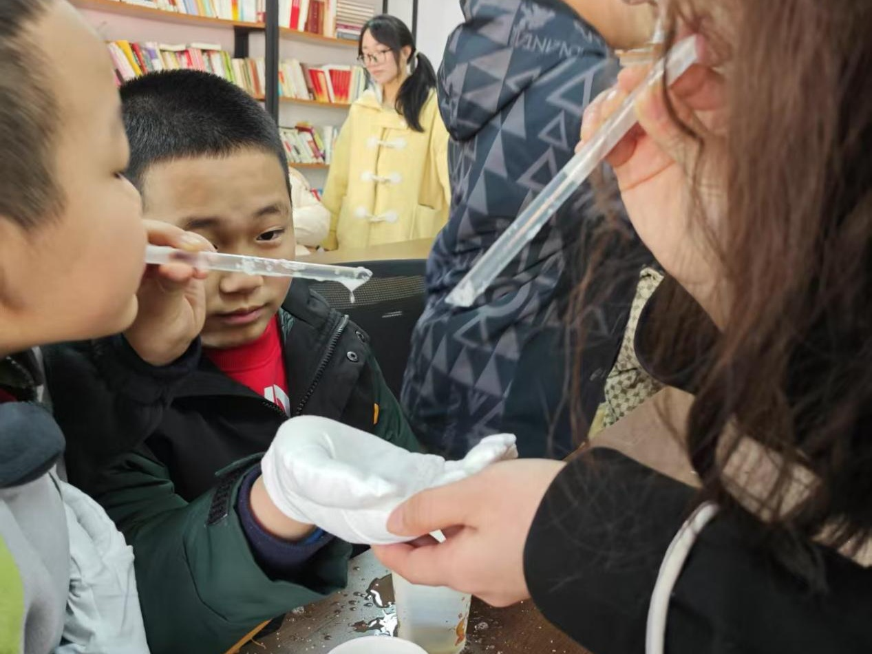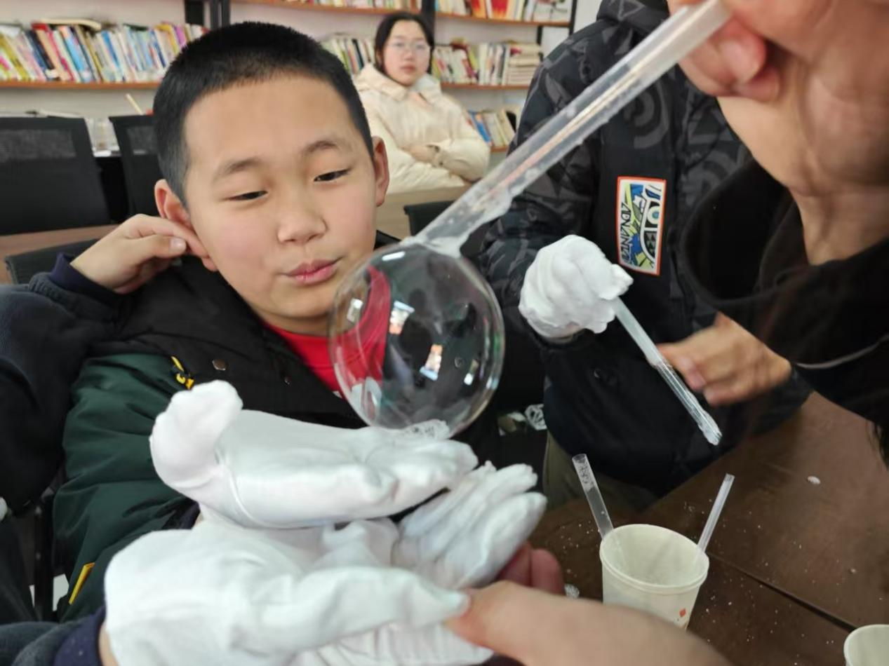 “弹跳的泡泡”实验中,志愿者们用白糖、洗洁精、温水、棉质手套和吸管,带领小朋友把白糖、洗洁精放进温水里搅拌,做出了神奇的泡泡液。当小朋友们用吸管吹出泡泡,泡泡落在棉质手套上,居然像一个个调皮的小精灵一样弹来弹去,就是不破。志愿者讲解棉质手套的柔软、良好吸水性和低摩擦力,加上白糖增加泡泡液黏度,共同造就了这一神奇现象。