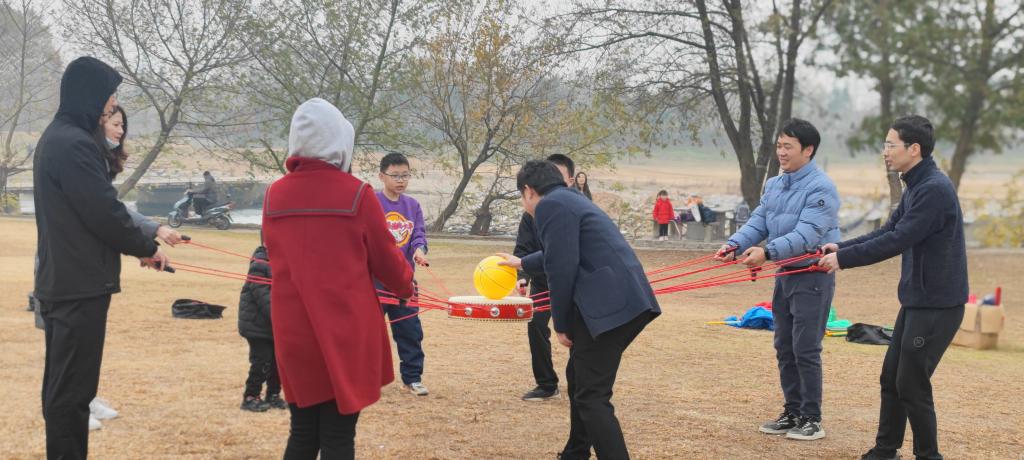 物电员工陈自华主持团建活动,大家在他设计的游戏环节牵手成圆、绕圈、蹦跳,动作协调,气氛开心和谐;之后,分组活动,7-10人合力使用一面鼓颠球,通过活动达到协作、协调、协同的境界,随团的小朋友热情高涨,也加入游戏队伍,尽管多次失败,但大家都很兴奋,并总结经验如何连续颠更多的球,欢笑在村野上空荡漾。