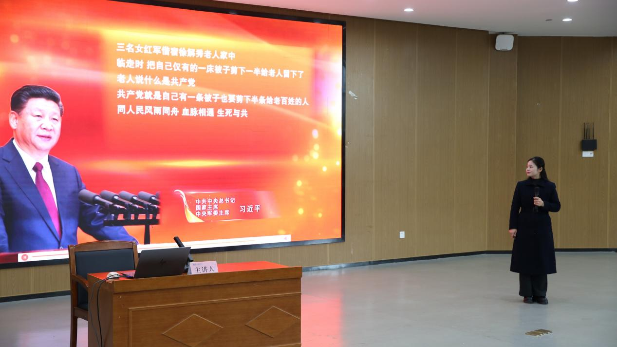 “半条被子”故事主人公徐解秀的曾孙女、专题陈列馆讲解员朱淑华以《半条被子温暖传承》为题,深情讲述了长征途中三位女红军与徐解秀“共用一床被”的温暖夜晚,分别时红军剪下半条被子的牵挂,以及徐解秀几十年如一日等待红军的鱼水情深。她通过这段感人至深的历史,生动诠释了“江山就是人民,人民就是江山”的深刻内涵,并引用习近平总书记“红色基因必须代代相传”的重要论述,号召广大青年学子牢记初心、传承力量,朱淑华的讲述深深打动了在场师生。