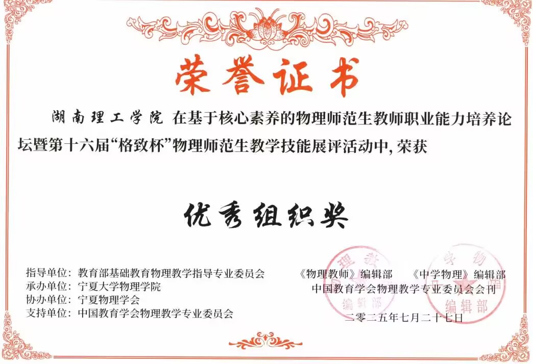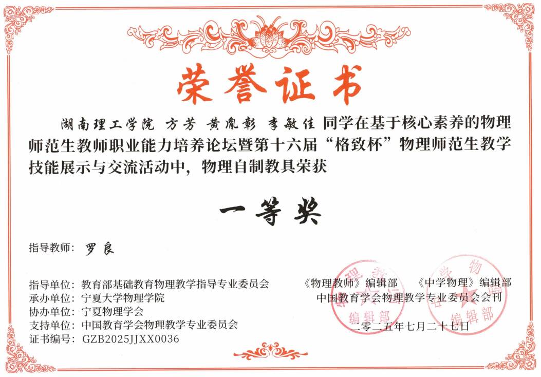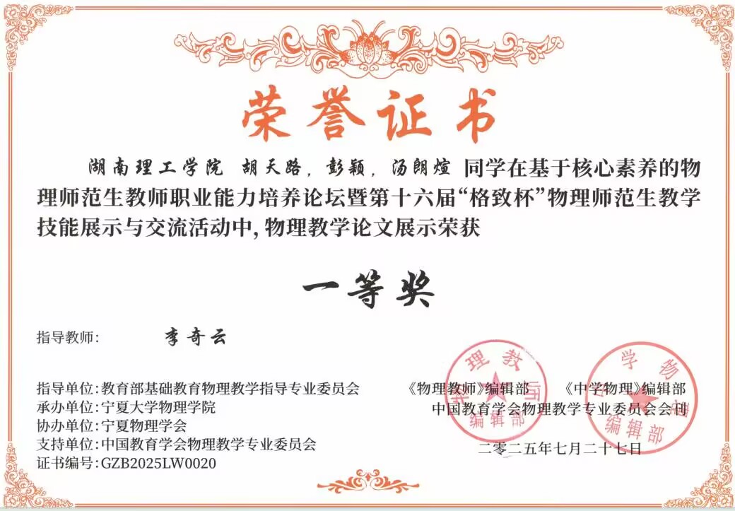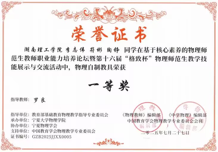 2025年7月,在第十六届“格致杯”物理师范生教学技能展评活动中,公司学子表现优异,beats365荣获优秀组织奖,物理23-1BS班的黄胤彰同学荣获“物理教学展示”一等奖;物理22-1BS班的李志伟、符彬、陶铮同学和物理23-2BS班的方芳、黄胤彰、李敏佳同学,荣获“物理自制教具”一等奖;学科教学(物理)2024级研究生胡天路、彭颖、汤朗煊同学荣获“物理教学论文展示”一等奖;此外,物理22-2BS班的舒铄茹、李享同学,物理23-1BS班的李诗扬同学,物理23-2BS班的王秋怡同学,学科教学(物理)2024级研究生彭颖、胡天路等同学荣获“物理教学展示”二等奖,物理23-2BS班的廖艳虹同学荣获“物理教学展示”三等奖;物理22-2BS班的孙静怡、董心慈、李享同学,物理23-2的张雅卉同学荣获“物理自制教具”二等奖,李诗扬、彭颖、胡天路的物理教具荣获三等奖;黄胤彰、董心慈、侯心怡、曾家豪、彭颖、胡天路等人的物理教学论文荣获二等奖。