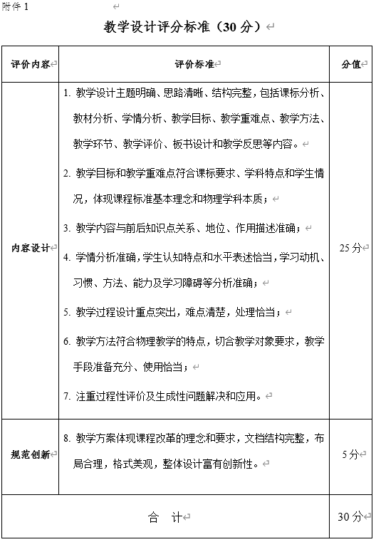 1. 教学设计(30%):选手从现行高中物理教材必修模块(人教版高中物理必修一、二、三册)中自选1课时新授课内容。教学设计要体现物理课程标准理念,阐释片段教学的设计依据,具体内容包括:课题名称、设计理念、课标分析、教材分析、学情分析、教学目标、教学方法、教学环节与教学创新等。(打印5份)