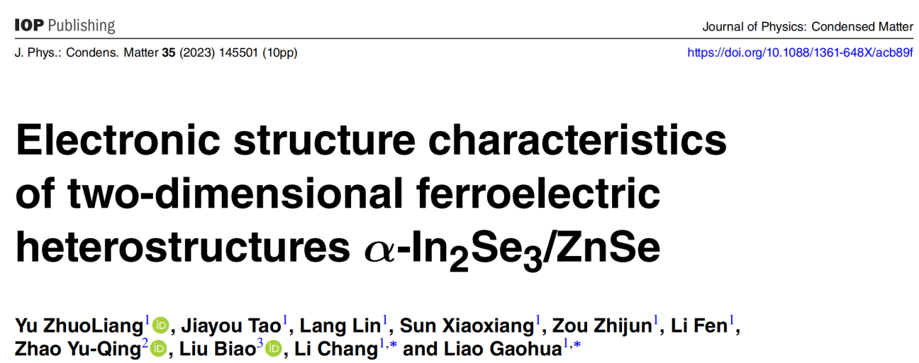 近期,禹卓良博士在国际学术期刊《Journal of Physics: Condensed Matter》发表题为“铁电异质结构α-In2Se3/ZnSe的电子结构特性”(Electronic structure characteristics of two-dimensional ferroelectric heterostructures α-In2Se3/ZnSe)的研究论文。论文通讯作者是公司的李昶博士和廖高华博士。论文基本信息如图1。