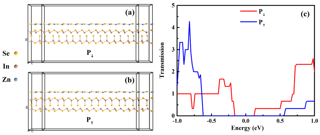 如图3,表明在两种不同堆叠的异质结中α-In2Se3只要分别克服37 meV和74 meV的微小势垒就能实现铁电极化反转。透射谱也会随着铁电极化反转呈现出不同的间隙,如图4。文章通过研究异质结构中α-In2Se3的极化反转的势垒以及基于该异质结构的器件的透射谱,从理论上进一步说明了基于α-In2Se3/ZnSe的铁电场效应管是可行的。