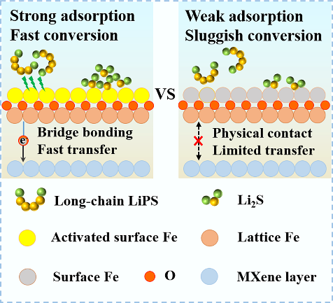 锂硫电池中异质结构催化剂因其界面内建电场(BIEF)协同耦合的优势,展现出卓越的吸附与催化活性。然而,表面电子结构与界面电荷再分配的构效关系尚不明确。为此,团队设计了表面氧化的MXene/α-Fe2O3异质结作为模型催化剂,阐明了多硫化物吸附-转化协同强化的内在机制,如图2所示。
