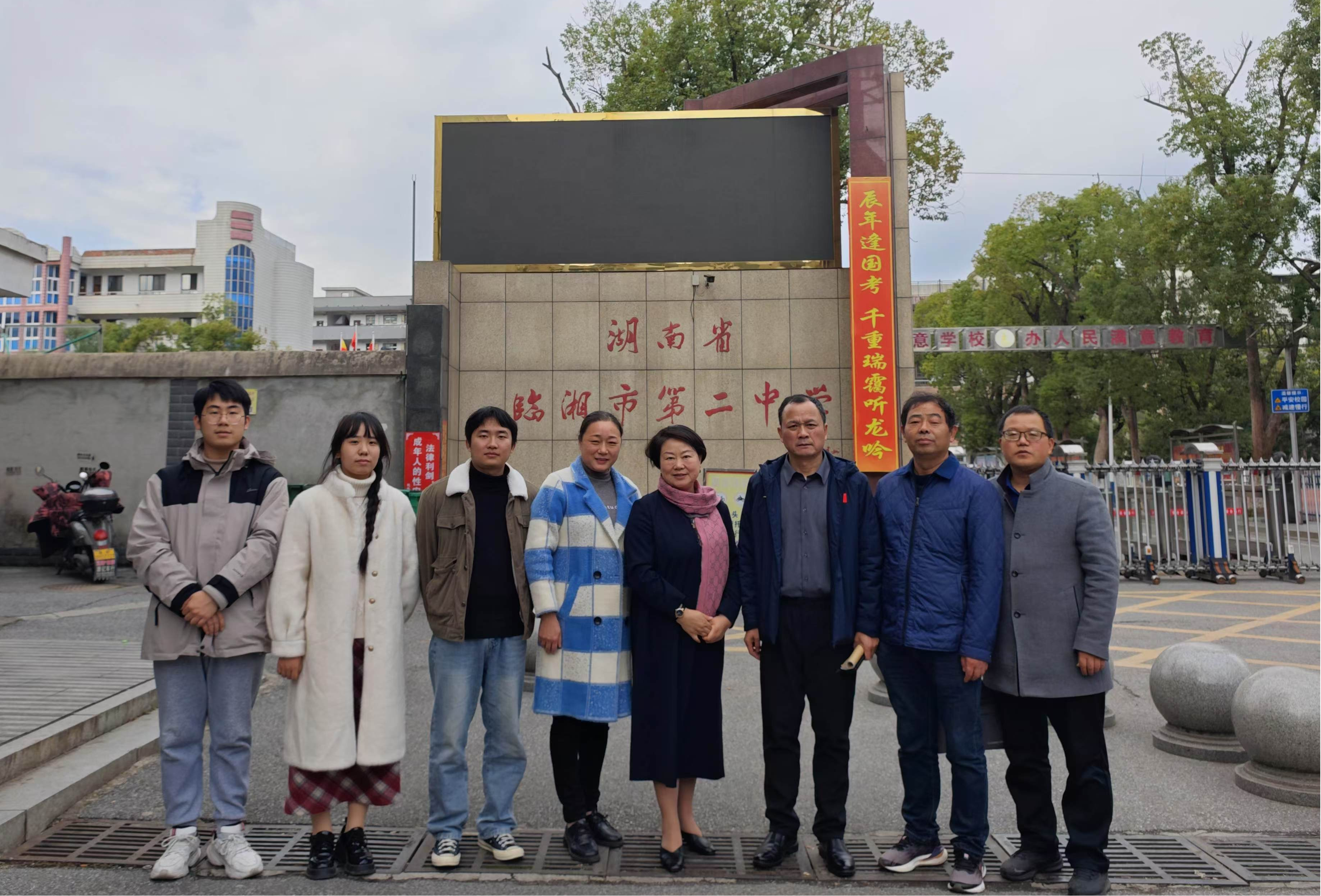 周畅一行与临湘二中主要领导、实习生合影